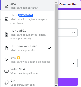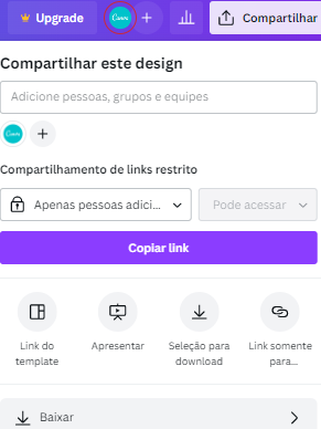 Após finalizar sua arte, selecione a opção "Compartilhar", em seguida escolha a opção “Baixar”.