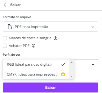 O sistema RGB são as cores digitais formadas pelas cores: vermelho, verde e azul. Ao criar a arte no Canva, seu layout estará na versão em RGB, e aqui, como em qualquer outra gráfica, você deve enviar a arte em CMYK, essas são as iniciais das cores: ciano, magenta, amarelo e preto.
